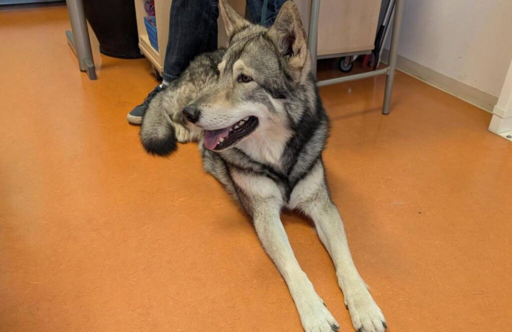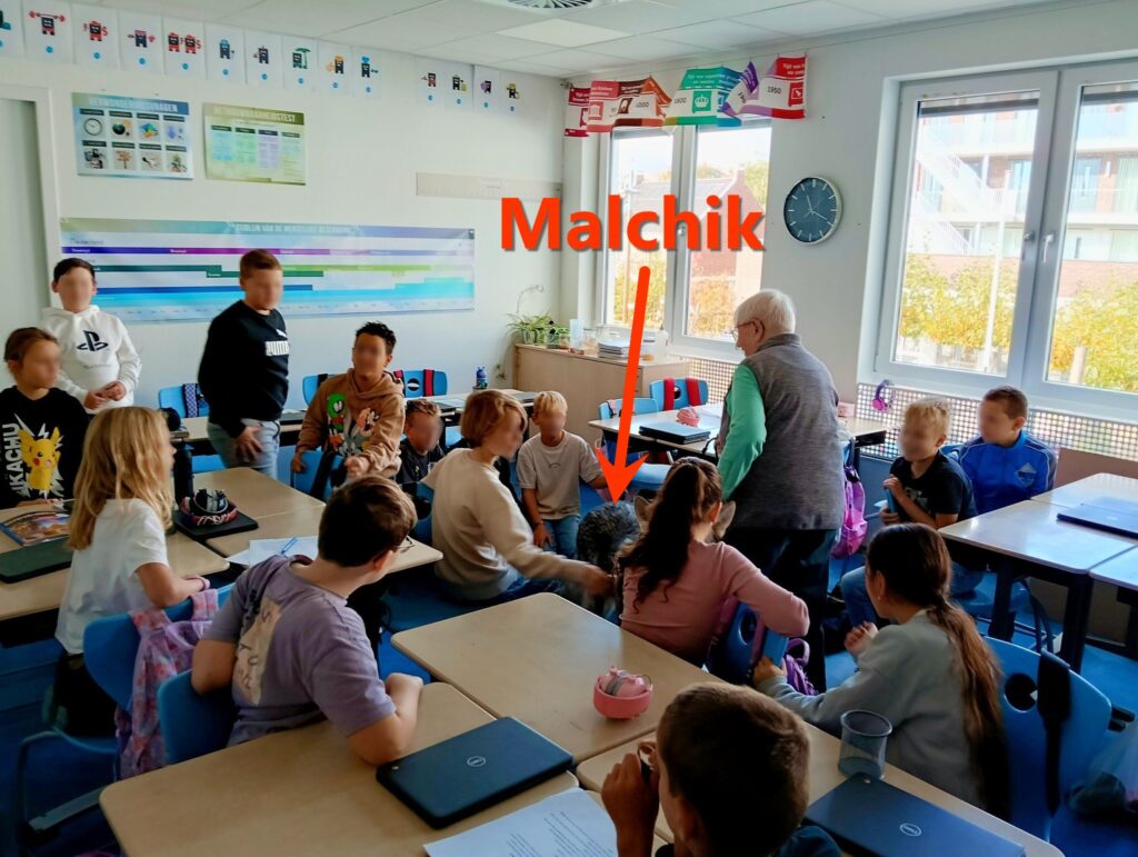 Een mooie samenwerking tussen de teams educatie van de Werkgroep Wolf Nederland en de Werkgroep Wolf Leusden tijdens het verzorgen van een gastles in de bovenbouw klassen in Leusden. De leerlingen waren zeer enthousiast en luisterden met aandacht naar het verhaal over de wolf. Blikvanger bij de lessen was de Saarlooswolfhond Malchik (hier wat verstopt op de foto), die regelmatig als mascotte meereist. De kinderen hadden zich echt verdiept in het onderwerp en kwamen met serieuze vragen. Geen waardeoordeel, maar oprecht geïnteresseerd. Ook een keer een gratis gastles op je school? Neem contact op met de werkgroep en informeer naar de mogelijkheden. Hieronder is Malchik beter te zien.